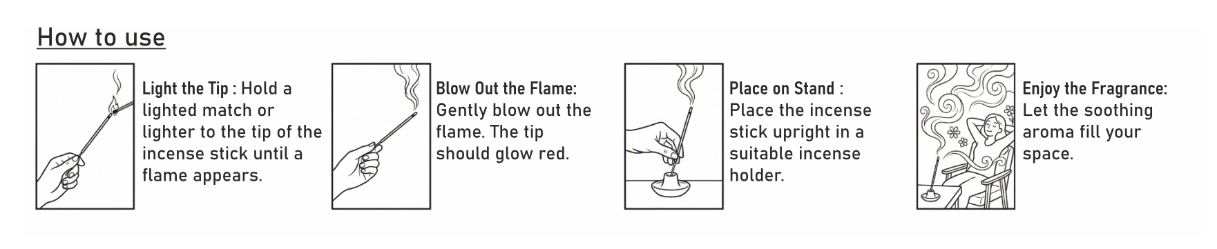 Usage Care : Light dhoop sticks only on a fireproof, heat-resistant surface using a suitable holder. Keep away from flammable materials such as curtains, wooden objects, or wires. Ensure proper ventilation in the area during use.